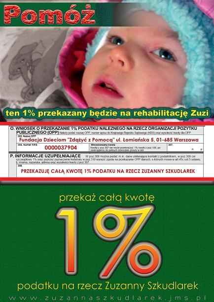 Jednocześnie chcemy poinformować o możliwości przekazania 1 procenta z podatku na rzecz rehabilitacji Zuzi, więcej informacji znajdziecie Państwo klikając w obrazek poniżej.